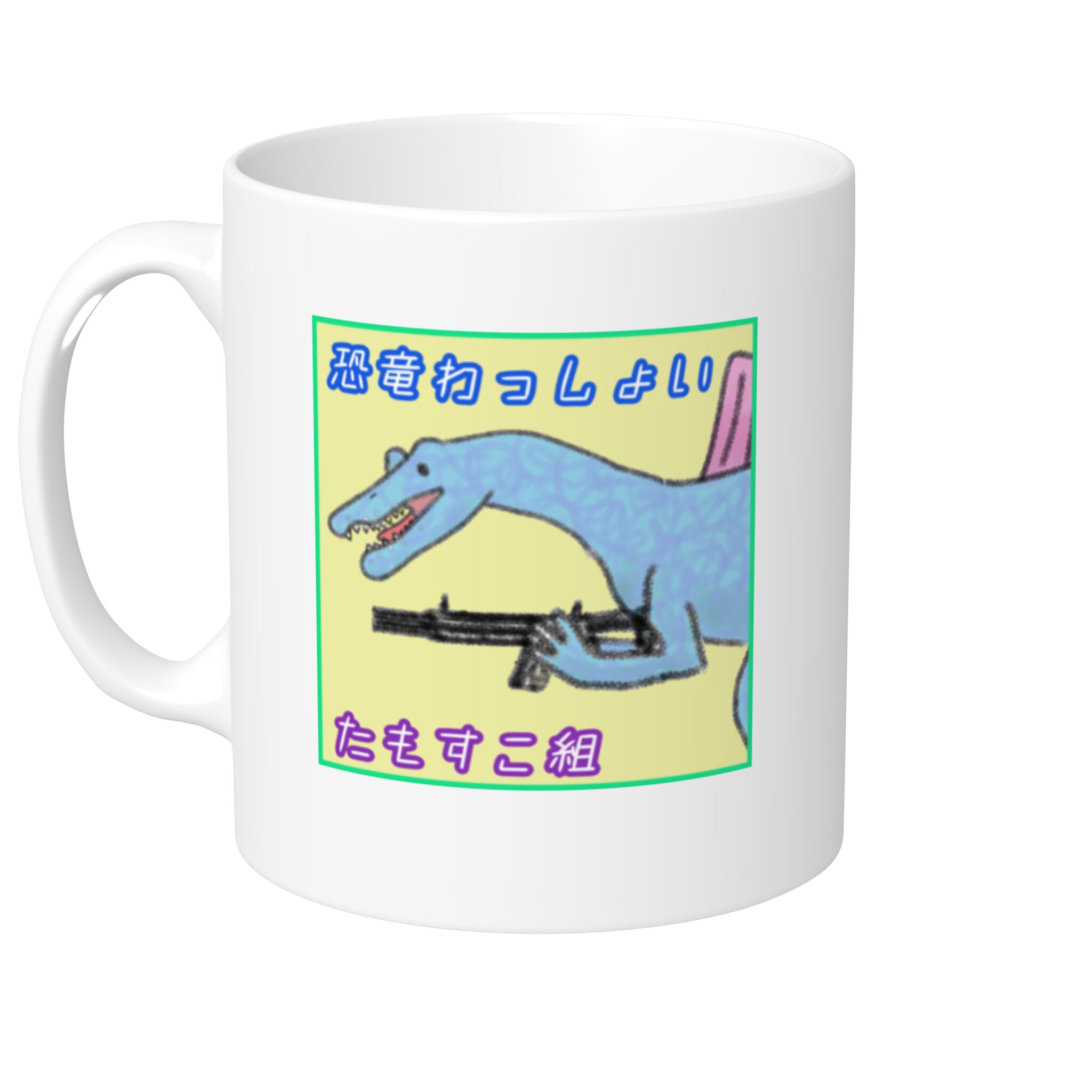 生田晴香の恐竜わっしょい!スピノサウルス✖️ハニーバジャーのカップです。右手で飲んだ時に向かい側に絵柄が見えるようになります。